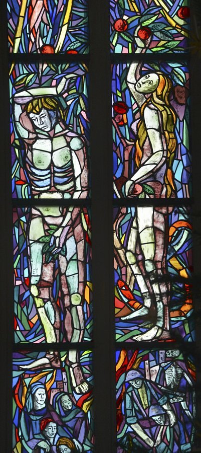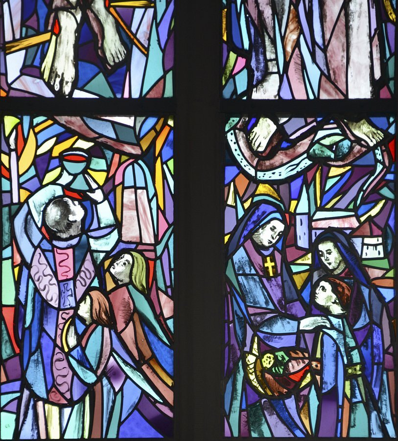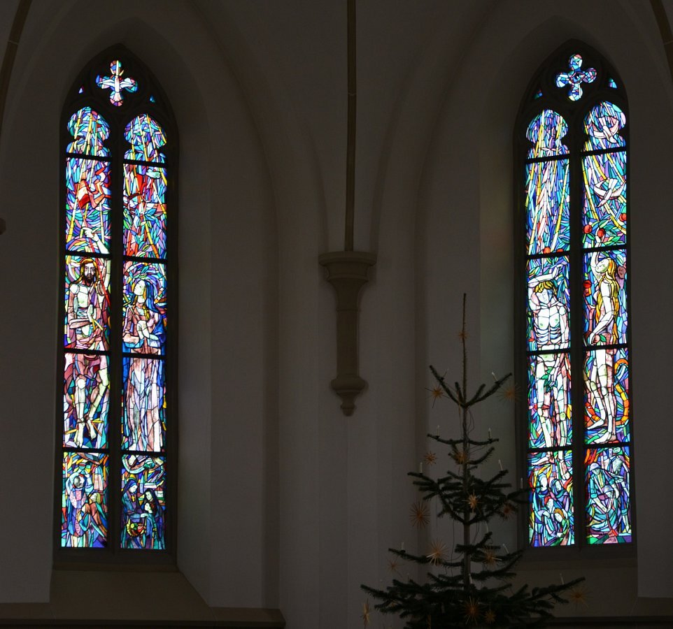 Im Chor zwei Glasfenster von Hubert Berchtold 1952: