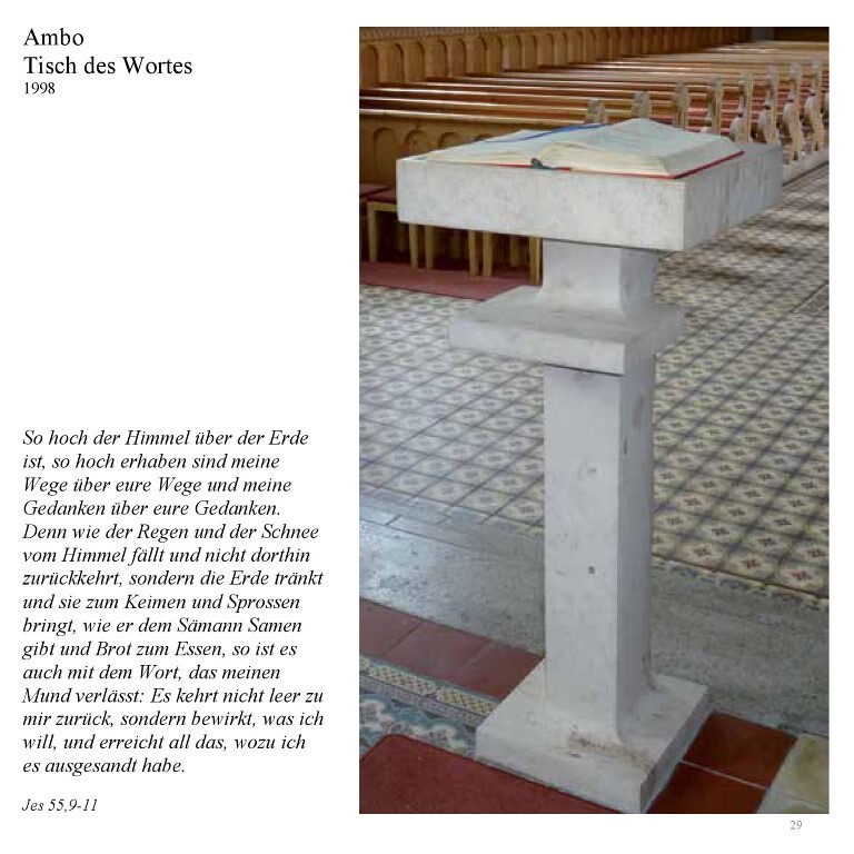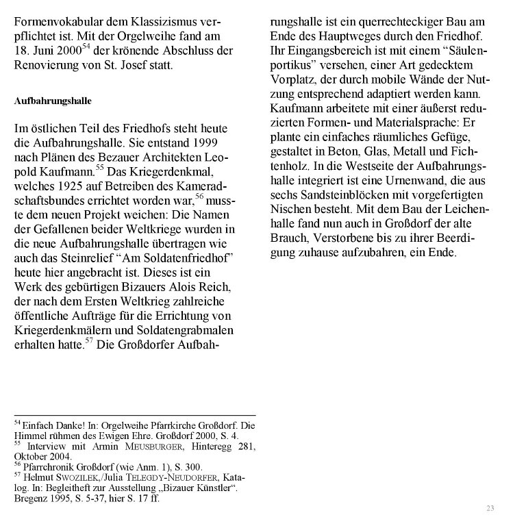 Im östlichen Teil des Friedhofs steht heute die Aufbahrungshalle. Sie entstand 1999 nach Plänen des Bezauer Architekten Leopold Kaufmann.[1] Das Kriegerdenkmal, welches 1925 auf Betreiben des Kameradschaftsbundes errichtet worden war,[2] musste dem neuen Projekt weichen: Die Namen der Gefallenen beider Weltkriege wurden in die neue Aufbahrungshalle übertragen wie auch das Steinrelief “Am Soldatenfriedhof” heute hier angebracht ist. Dieses ist ein Werk des gebürtigen Bizauers Alois Reich, der nach dem Ersten Weltkrieg zahlreiche öffentliche Aufträge für die Errichtung von Kriegerdenkmälern und Soldatengrabmalen erhalten hatte.[3] Die Großdorfer Aufbahrungshalle ist ein querrechteckiger Bau am Ende des Hauptweges durch den Friedhof. Ihr Eingangsbereich ist mit einem “Säulenportikus” versehen, einer Art gedecktem Vorplatz, der durch mobile Wände der Nutzung entsprechend adaptiert werden kann. Kaufmann arbeitete mit einer äußerst reduzierten Formen- und Materialsprache: Er plante ein einfaches räumliches Gefüge, gestaltet in Beton, Glas, Metall und Fichtenholz. In die Westseite der Aufbahrungshalle integriert ist eine Urnenwand, die aus sechs Sandsteinblöcken mit vorgefertigten Nischen besteht. Mit dem Bau der Leichenhalle fand nun auch in Großdorf der alte Brauch, Verstorbene bis zu ihrer Beerdigung zuhause aufzubahren, ein Ende.