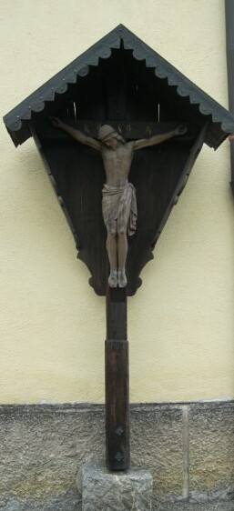 An der Ostseite der Großdorfer Kirche steht das Missionskreuz (Deltoid, verschalt mit Blechdach). Die Füße des Gekreuzigten sind eigenartigerweise nebeneinander gestellt.